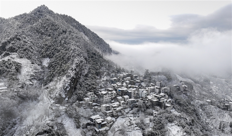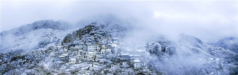 不止黄山,徽州各处皆藏雪趣。徽州天路的观景台覆上厚雪,雪后的盘山道如银蛇缠绕青山,蜿蜒向远方;歙县箬岭古村,白絮轻压黛瓦,整个村落半掩于雪帘之中,尽显古朴静谧;搁船尖上,白雪点缀林梢,山涧隐于白绒之下,天地间静得只剩落雪的轻响。