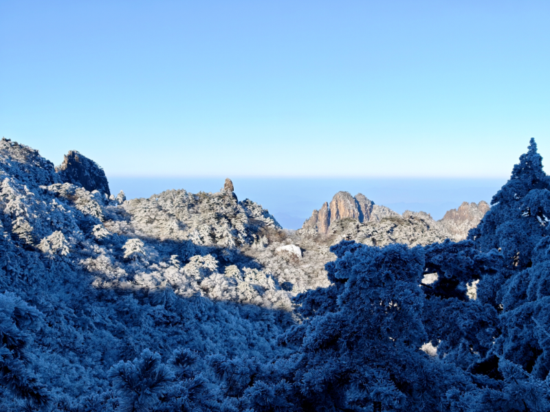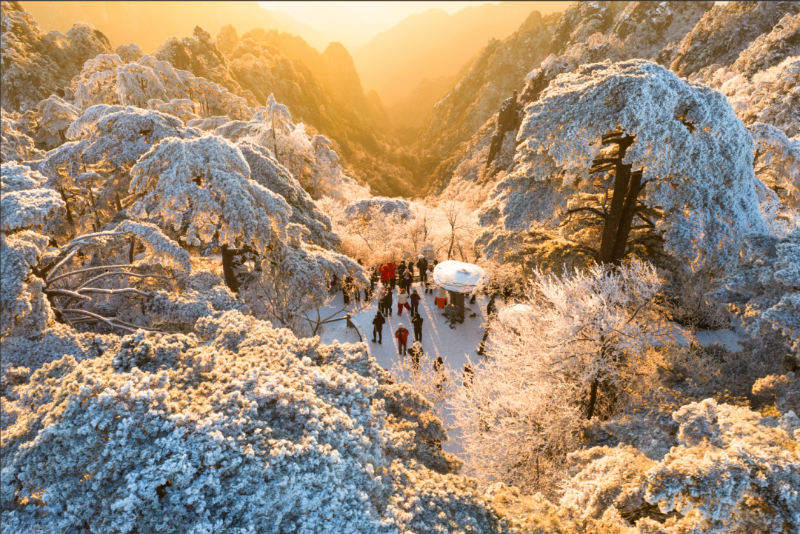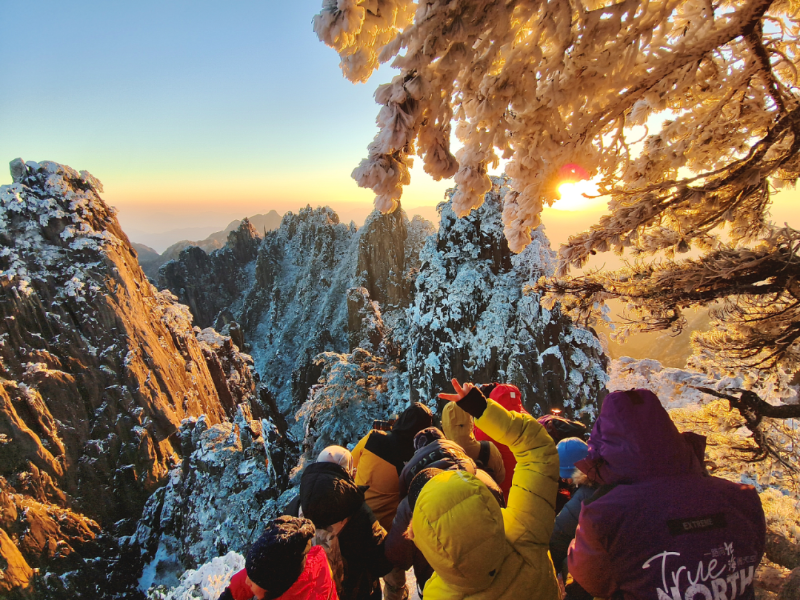 近日,黄山风景区,雪后初霁,雾凇、云海、日出三大景观同现,绘就出一幅冬日仙境画卷。奇松怪石银装素裹,晶莹雾凇挂满枝头,在阳光下熠熠生辉。
